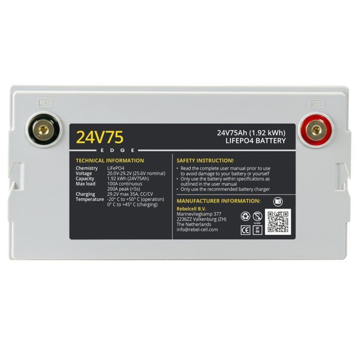 Met zijn compacte formaat, hoge capaciteit en slimme technologie is de Rebelcell 24V75 EDGE de betrouwbare energieoplossing voor 24V en uitbreidbare 48V systemen aan boord of onderweg.